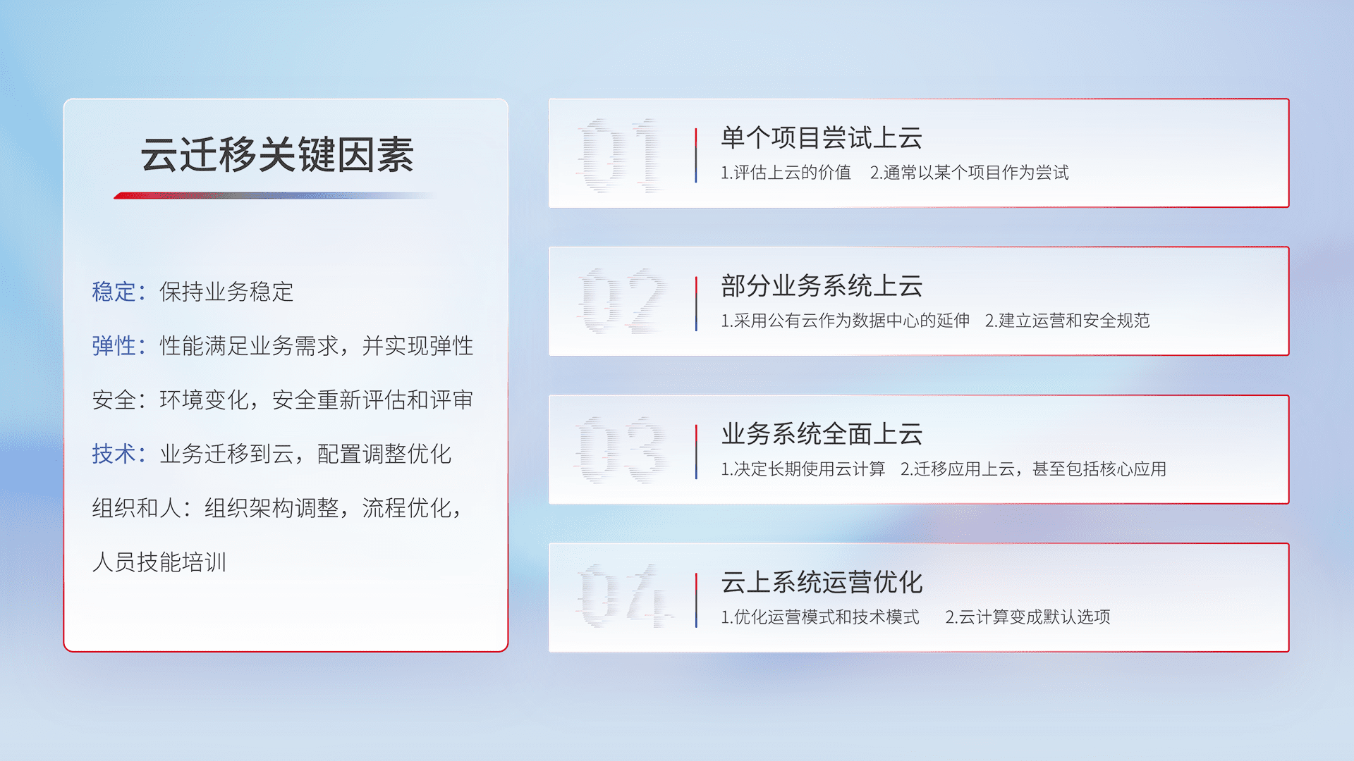 结合实际业务,,,,从规划设计、、云平台选型、、云原生改造、、、、数据迁移、、、、集成交付,,迁移全过程为客户识别最佳上云路径,,做好风险识别管理,,设计网络架构、、身份权限、、、、安全审计合规、、、、操作审计、、日志审计、、、监控告警策略、、、多站点容灾设计等,,,对云上基础设施进行整体规划,,提升IT治理水平,,,以满足弹性、、、、高可用、、高性能的需求。。。。
