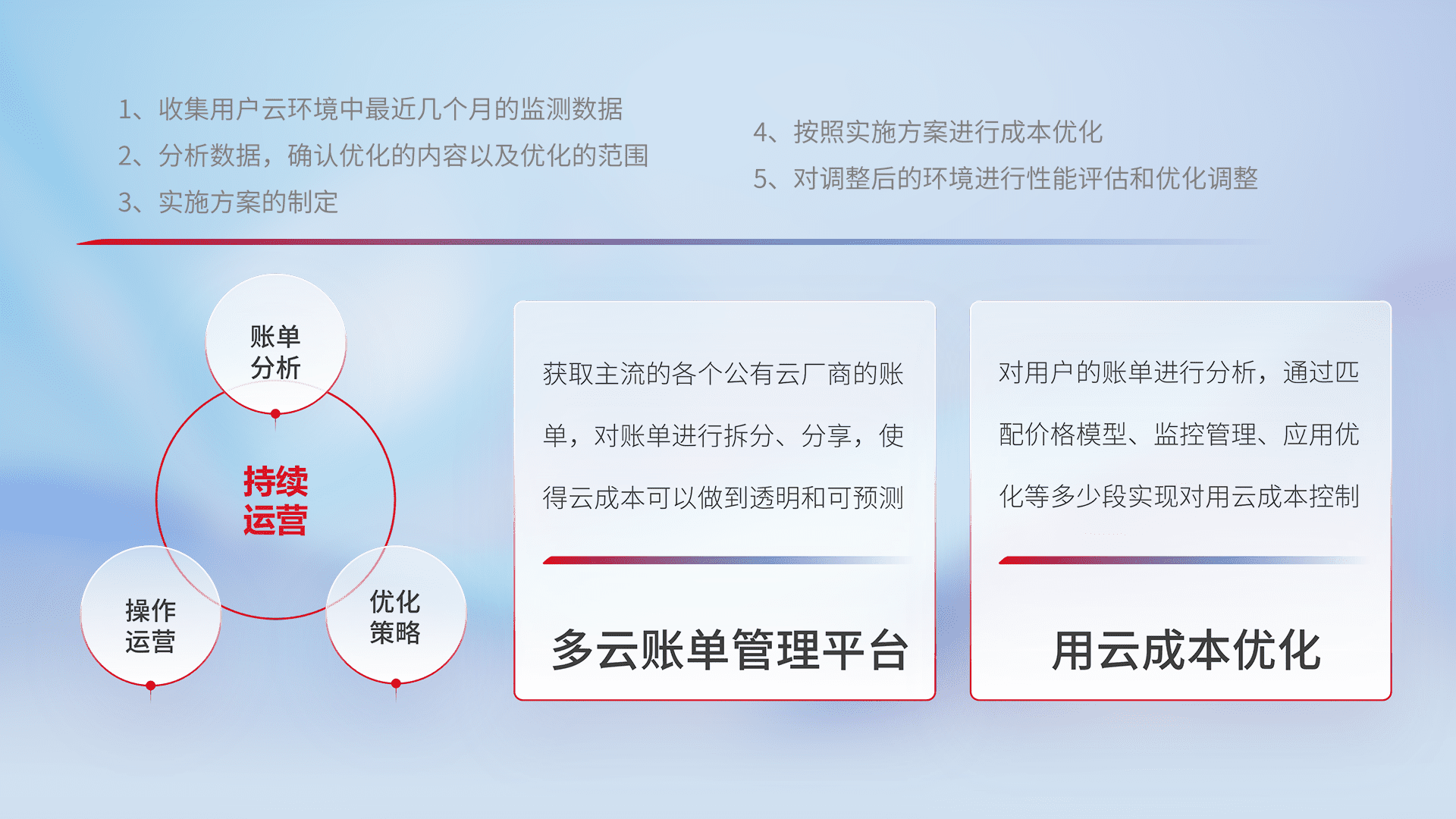 通过多云纳管,,以统一的资源数据模型把客户的云资源进行抽象和封装,,,,进而实现对多云资源的统一操作,,,保障云资源管理的可靠性、、、、稳定性与可用性。。。。量身定制化运维内容,,配置、、、、开发运维、、补丁管理、、、、备份、、、监控、、、、认证和访问管理、、审计和日常巡检等,,,,保障在用云过程中的可靠度,,,,稳定度以及高可用率。。。。